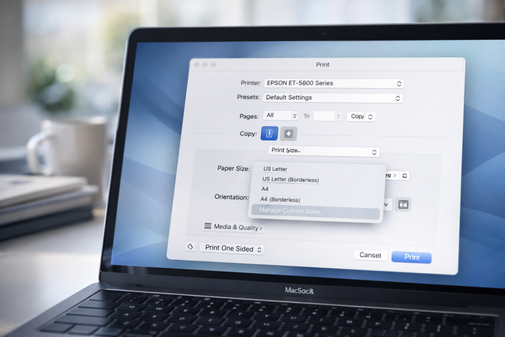On a Mac, the Manage Custom Sizes function is part of the standard print dialog. It allows users to define custom dimensions when the preset paper sizes (like A4, Letter, Legal) aren’t suitable. Apple Support